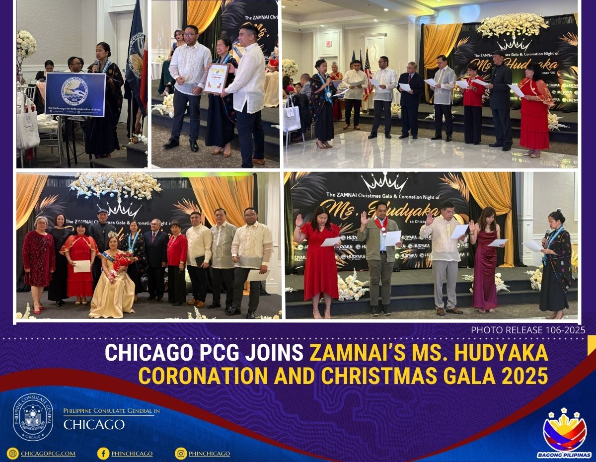 15 December 2025 - The Philippine Consulate General, represented by Consul Ma. Theresa M. Alders and accompanied by Cultural Officer Mary Joy Duran-Mortel, participated in the coronation of the Ms. Hudyaka and Christmas Gala 2025 organized by the Zamboanga del Norte Association of Illinois (ZAMNAI) on 13 December 2025 at the Lone Tree Manor, Niles, Illinois. The event was a lively celebration of Filipino heritage, fostering unity and cultural pride among attendees. [END]