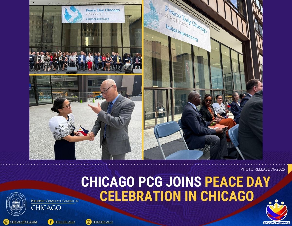 Chicago, 22 September 2025: The Philippine Consulate General in Chicago joined the diplomatic corps, the Chicago City Government, schools and the Peace School for the 47th Anniversary of Peace Day Chicago. Consul Ma. Theresa Alders and Mr. Richard Osea represented the Philippine Consulate at the event.