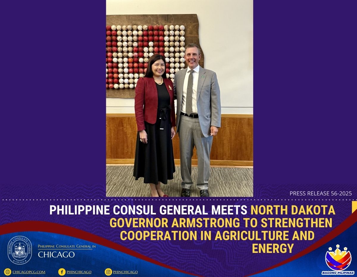 Bismarck, North Dakota – Philippine Consul General Melanie Rita B. Diano met with North Dakota Governor Kelly Armstrong to explore opportunities for deepening cooperation in the fields of agriculture and energy, reaffirming the Philippines’ role as a key partner of the United States in trade and investment.