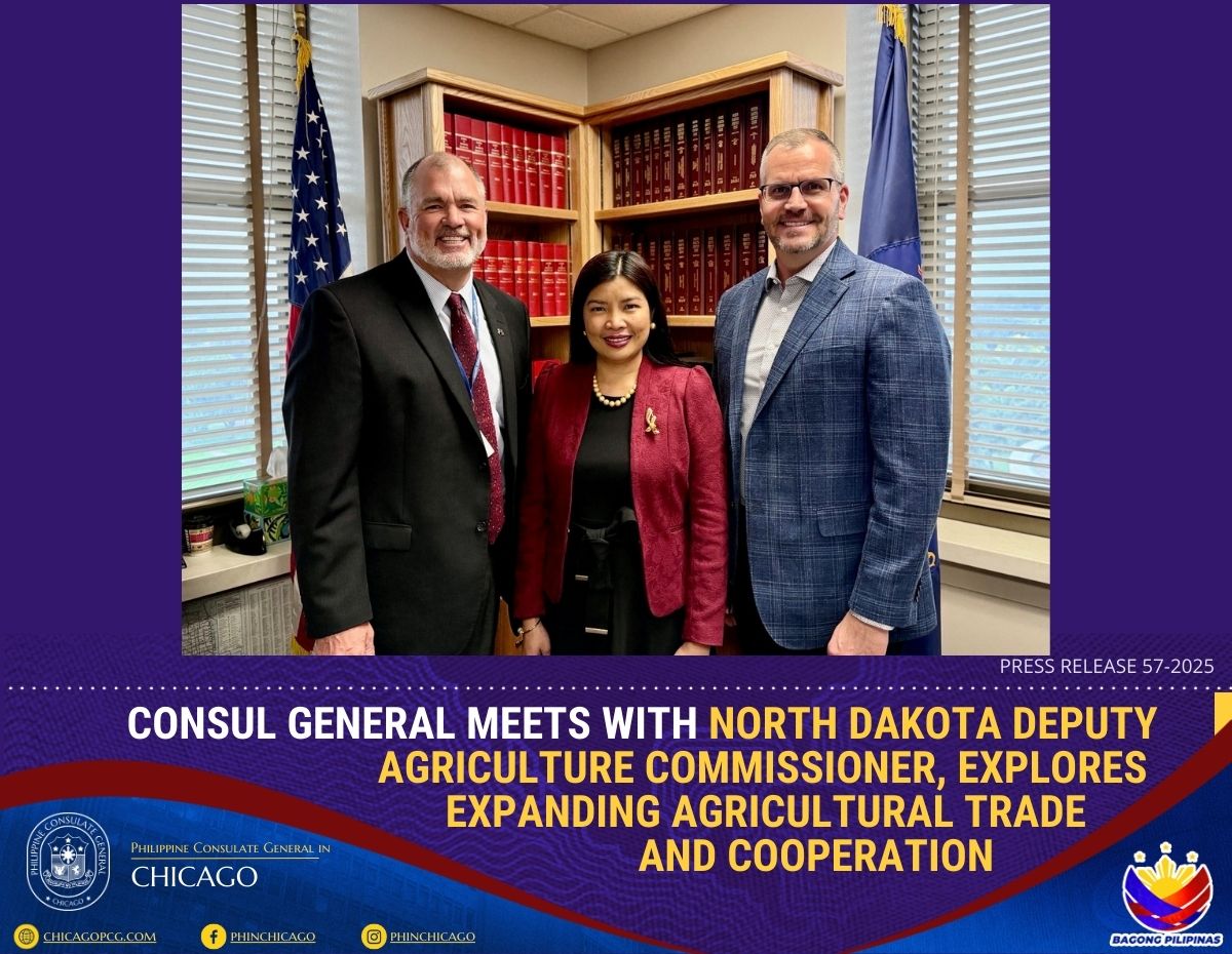 Consul General Melanie Rita B. Diano met with North Dakota Deputy Agriculture Commissioner Tom Bodine, together with Mr. Craig Kleven, Dirctor of Industry Relations of the North Dakota Soybean Council; Mr. John Schneider, Director of the Business, Marketing & Information Division of the Department of Agriculture; and Ms. Shanna Johnson, Director of International and Domestic Marketing of the Department of Agriculture. The Consul General was accompanied by Consul Ella Karina Mitra and Mr. Richard Osea.