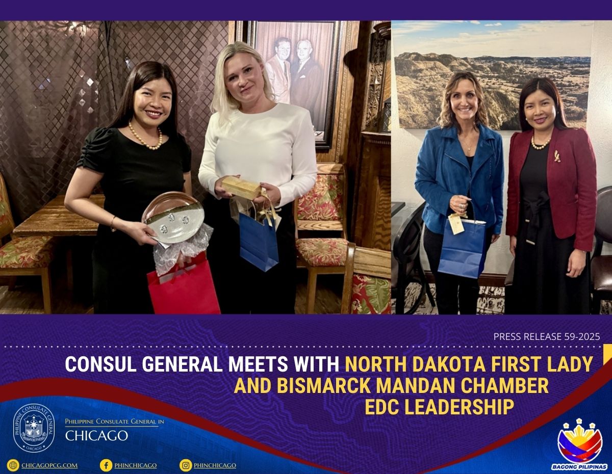 Bismarck, North Dakota – Consul General Melanie Rita B. Diano met with North Dakota First Lady Kjersti Armstrong and Ms. Brenda Nagel, President and CEO of the Bismarck Mandan Chamber EDC, in introductory meetings aimed at exploring opportunities for collaboration between North Dakota and the Philippines.
