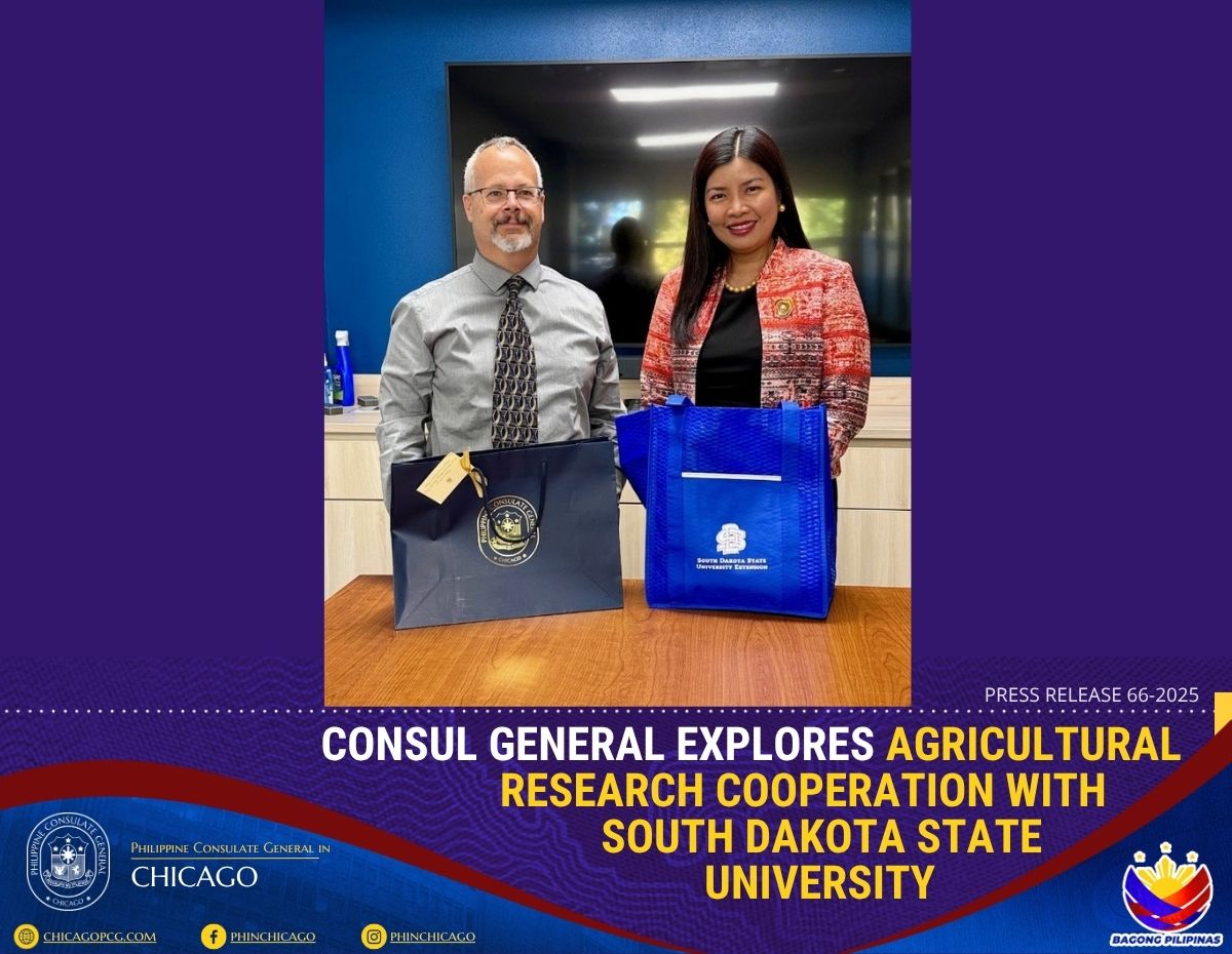 CHICAGO 21 October 2025- Consul General Melanie Rita B. Diano South Dakota State University (SDSU) Extension’s Interim Director Dr. Alexander Smart on 17 October 2025 at SDSU’s Berg Agricultural Hall in Brookings, South Dakota. She was accompanied by Consul Melvin Almonguera.