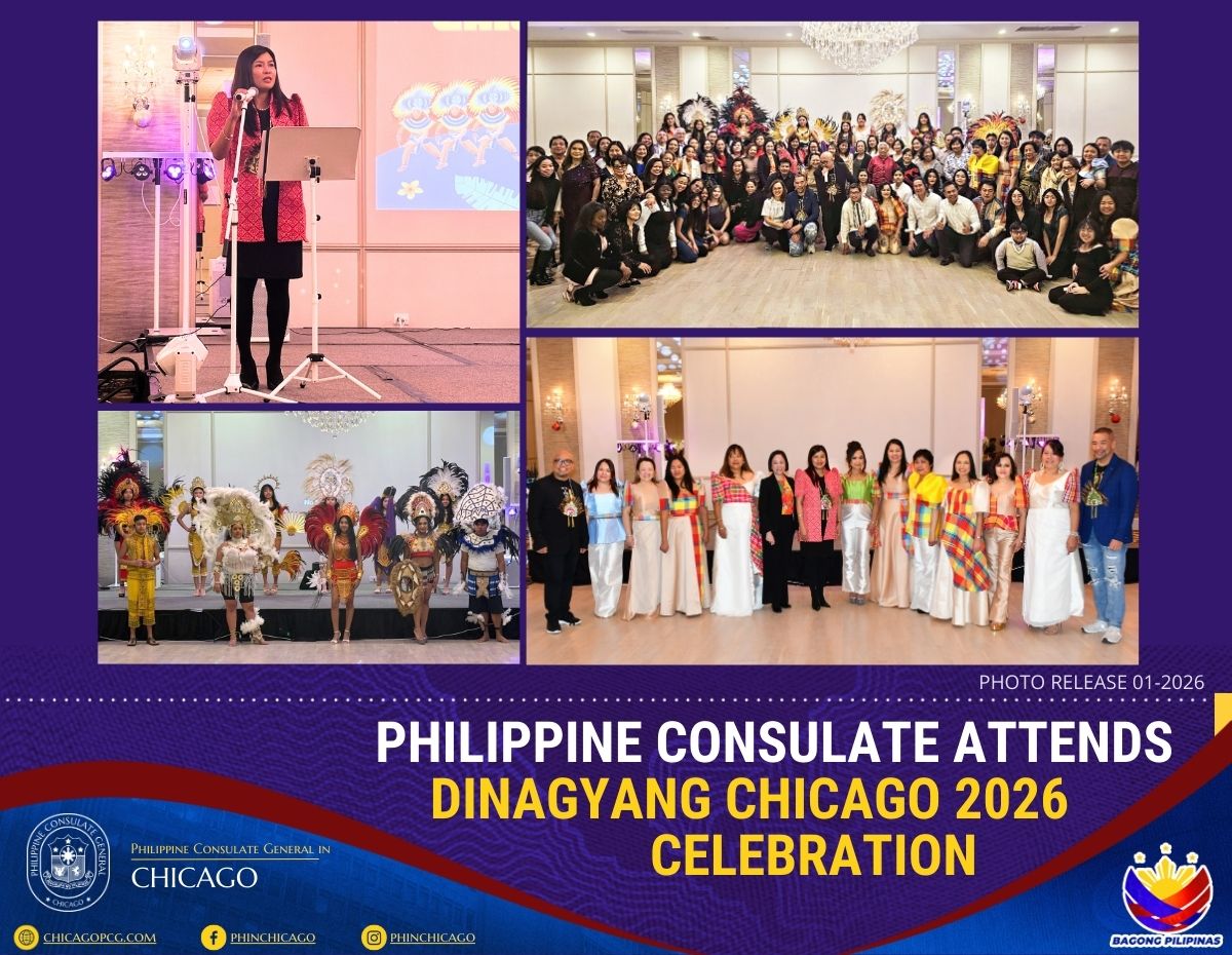 Consul General Melanie Rita Diano, accompanied by Cultural Officer Mary Joy Duran-Mortel, graced the Dinagyang Chicago 2026 celebration on 04 January 2026 at Allegre Banquets, Schiller Park, Illinois.