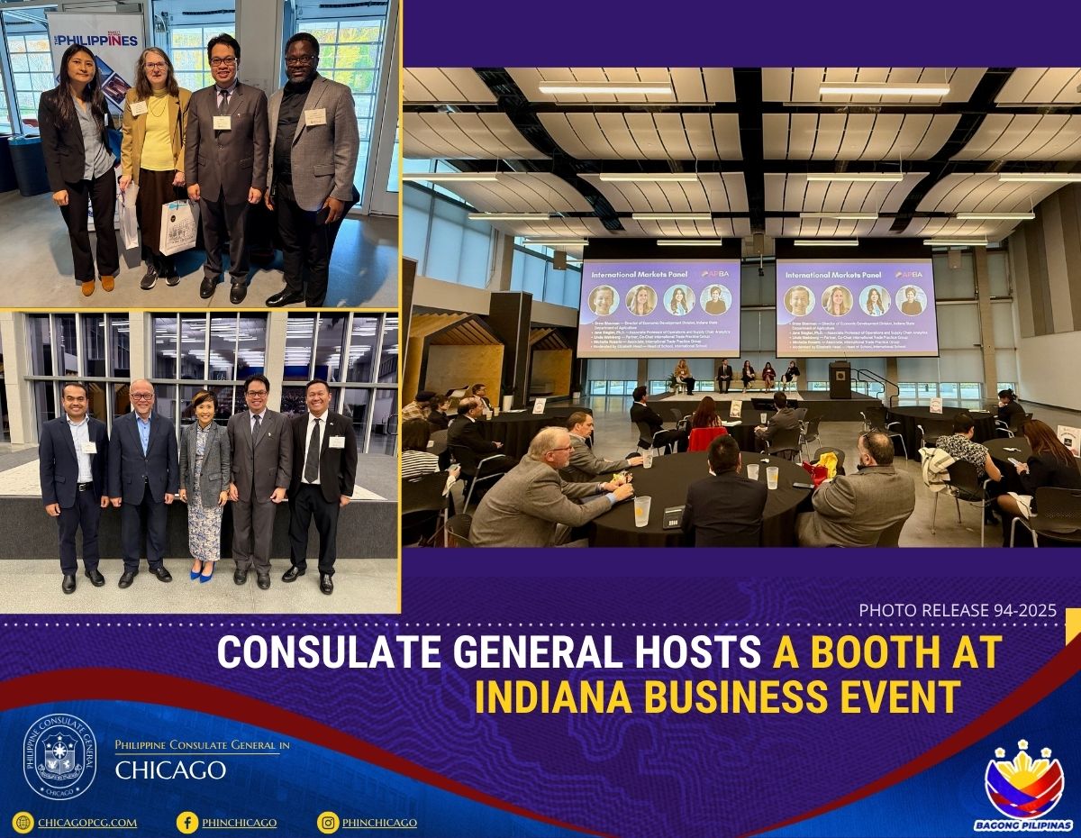 The Philippine Consulate General in Chicago, represented by Consul Melvin Almonguera and Protocol Officer Martyn Asker Orcine, manned a country booth on the sidelines of a business conference organized by the Asia-Pacific Business Association of Indiana (APBAI) held at The Heritage Group Center in Indianapolis, Indiana on 05 November 2025. The APBAI, formerly the America China Society of Indiana (ACSI), is a non-profit business group that fosters connections between Indiana and the Asia-Pacific region.