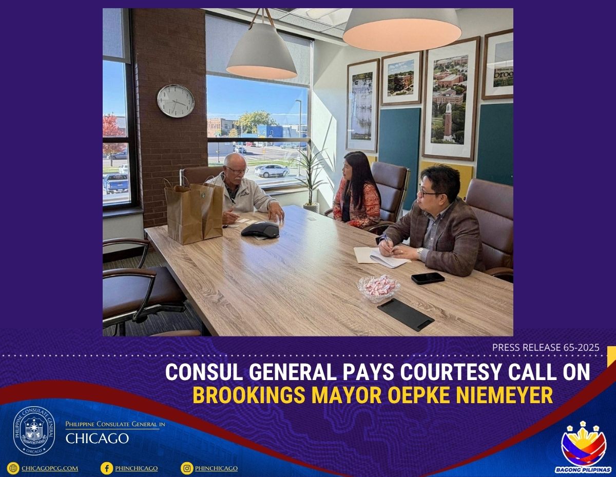 CHICAGO 21 October 2025- On 17 October 2025, Consul General Melanie Rita B. Diano called on Brookings Mayor Oepke Niemeyer at the Brookings City & County Government Center in Brookings, South Dakota. She was accompanied by Consul Melvin Almonguera.