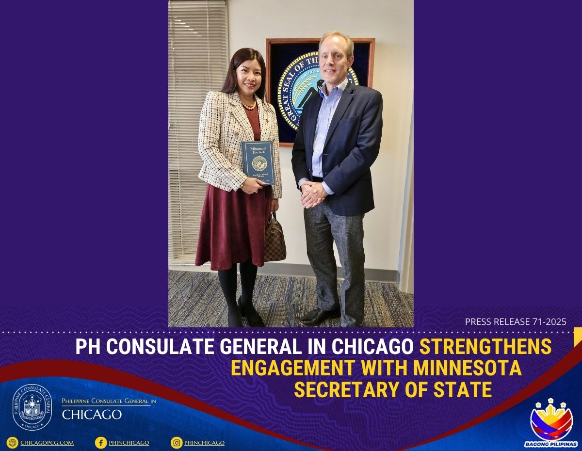 CHICAGO, 17 November 2025 - Consul General Melanie Rita B. Diano met with Minnesota Secretary of State Steve Simon on 14 November 2025 at the Office of the Secretary of State in St. Paul. The meeting served as an opportunity for both sides to reaffirm the strong people-to-people connections between the Philippines and Minnesota and to identify areas for enhanced cooperation.