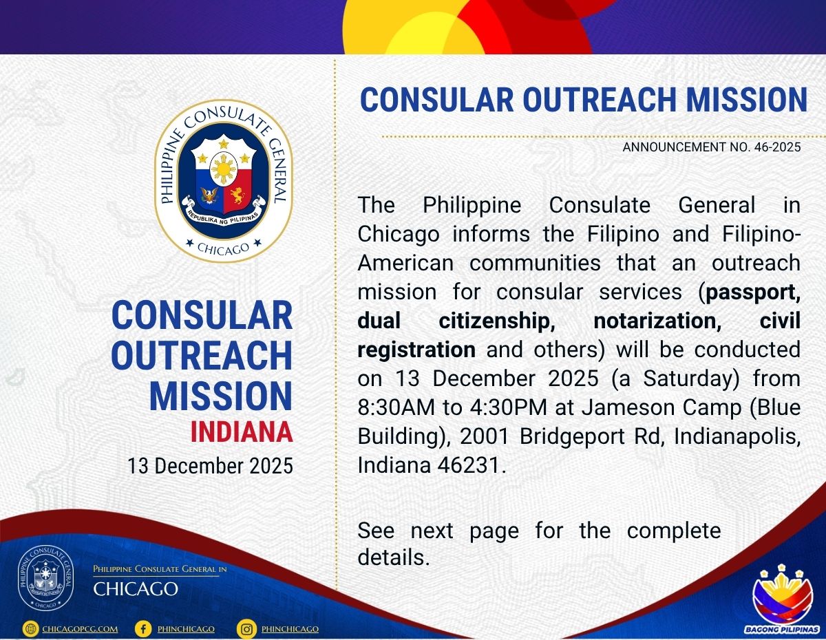 The Philippine Consulate General in Chicago informs the Filipino and Filipino-American communities that an outreach mission for consular services (passport, dual citizenship, notarization, civil registration and others) will be conducted on 13 December 2025 (a Saturday) from 8:30AM to 4:30PM at Jameson Camp (Blue Building), 2001 Bridgeport Rd, Indianapolis, Indiana 46231.