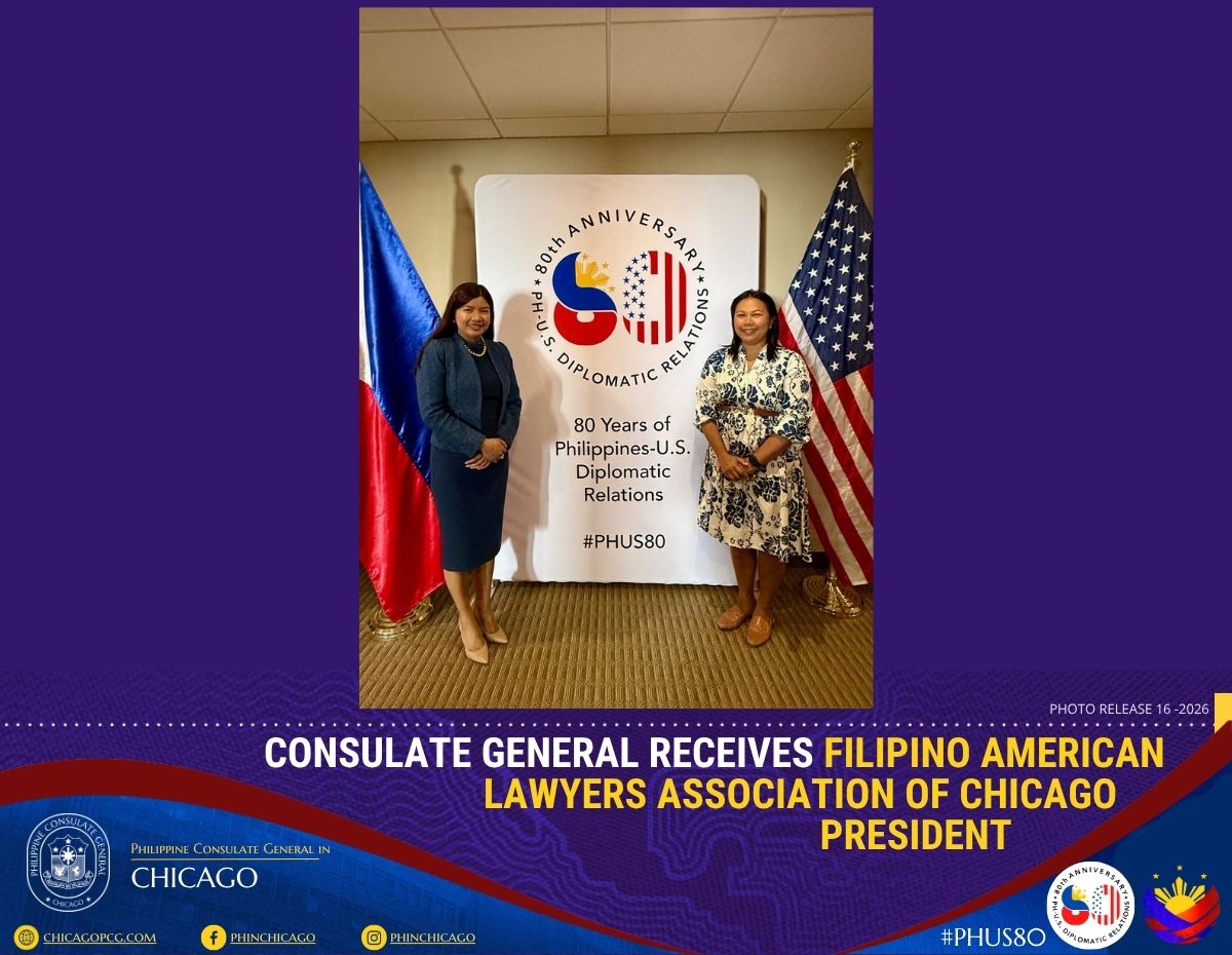 On 13 April 2026, Atty. Zenia Salles, President of Filipino American Lawyers Association of Chicago (FALA-Chicago), called on Consul General Melanie Rita B. Diano to explore potential areas of cooperation in support of the Filipino community in the U.S. Midwest. The Consul General was joined by Consul Melvin Almonguera.