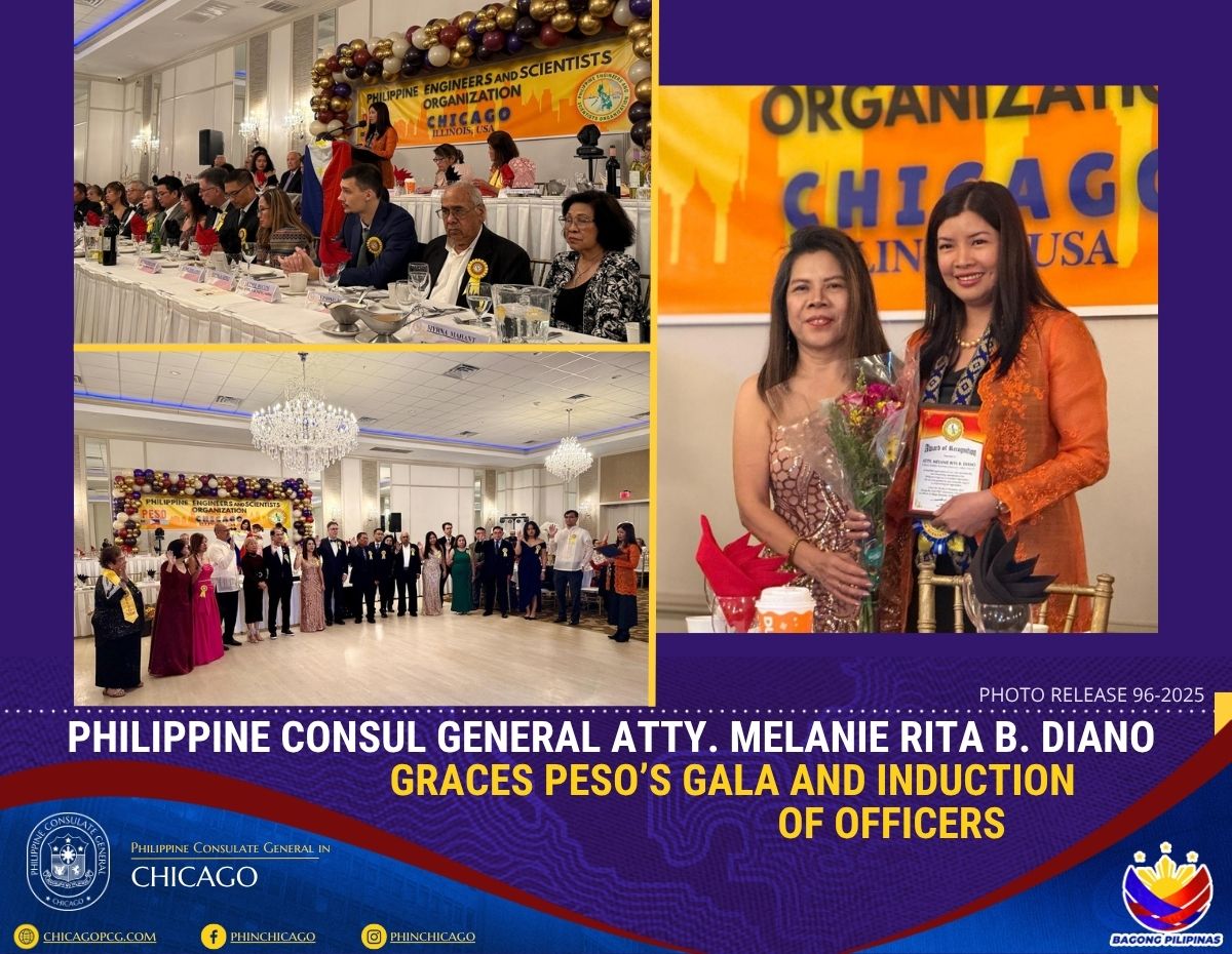 CHICAGO, ILLINOIS – Consul General Atty. Melanie Rita B. Diano, upon the invitation of Dr. Evelyn Natividad, outgoing President of the Philippine Engineers and Scientists Organization (PESO), graced the 52nd PESO Gala and Induction of Officers on 09 November 2025 at the Allegra Banquets in Schiller Park, Illinois. Consul General Diano was accompanied by Ms. Lizbeth Pangan and Mr. Richard Osea.