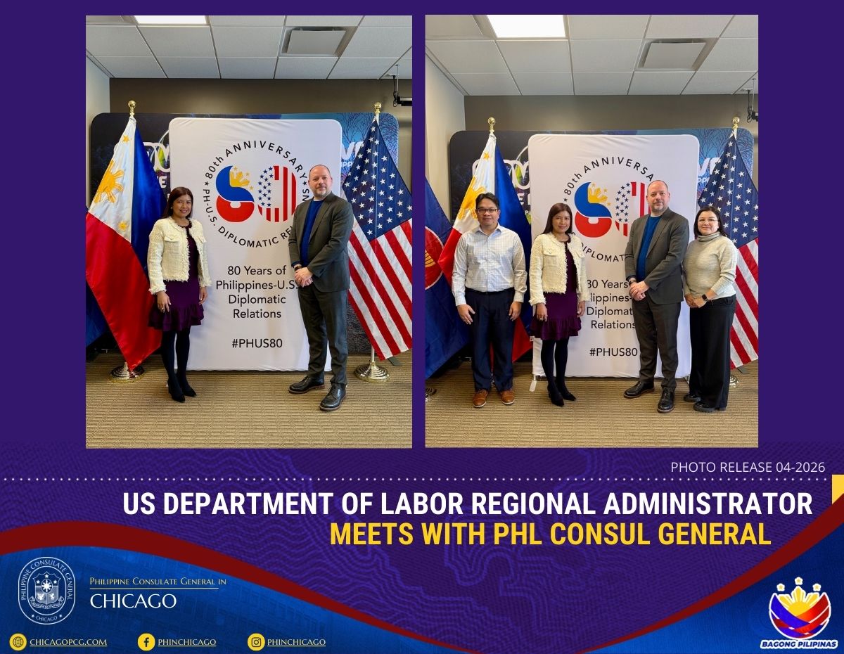 Consul General Melanie Rita B. Diano, accompanied by Consul Melvin Almonguera, hosted Mr. Michael Lazzeri, senior official of the US Department of Labor (DOL) and Regional Administrator for the Midwest Region of the Wage and Hour Division (WHD), at the Consulate General on 05 February 2026. He was joined by Ms. Aracely Galvan of the WHD’s Chicago District Office.