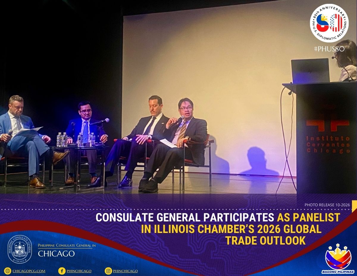The PHL Consulate General, represented by Consul Melvin Almonguera, participated in a panel discussion on regional developments during the Illinois Chamber of Commerce’s 2026 Global Trade Outlook held on 27 February 2026 at Instituto Cervantes in Chicago. He was joined in the panel by Director Mario Quina of the Portuguese Trade and Investment Agency in Chicago, Consul Gabriel Mendoza of the Mexican Consulate General, and Mr. Jean-François Hould of the Québec Government Office in Chicago.