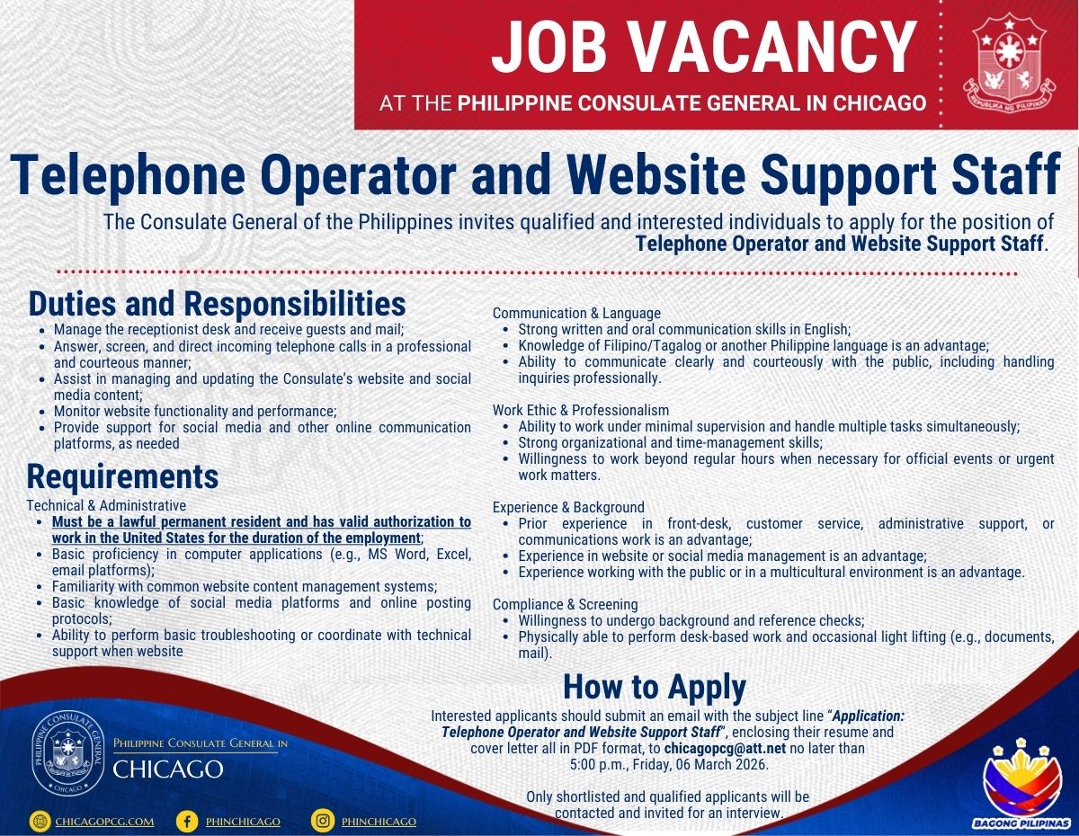 The Consulate General of the Philippines invites qualified and interested individuals to apply for the position of Telephone Operator and Website Support Staff.